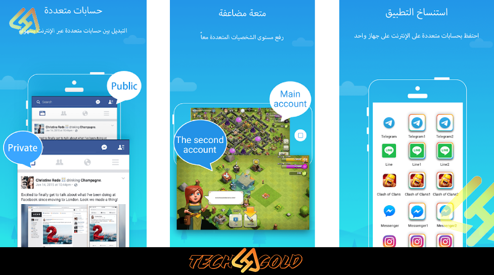 - تشغيل أكثر من حساب لتطبيق واحد على نفس الهاتف بسهولة.