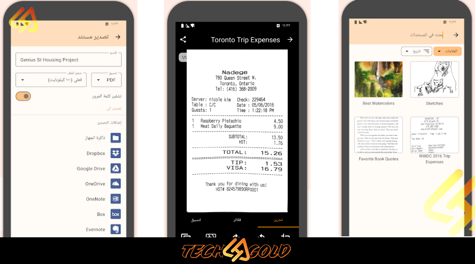 - يدعم مسح أنواع مختلفة من المستندات مثل الفواتير، الإيصالات، العقود، ملاحظات، أوراق مكتوبة بخط اليد، صفحات كتب… إلخ.